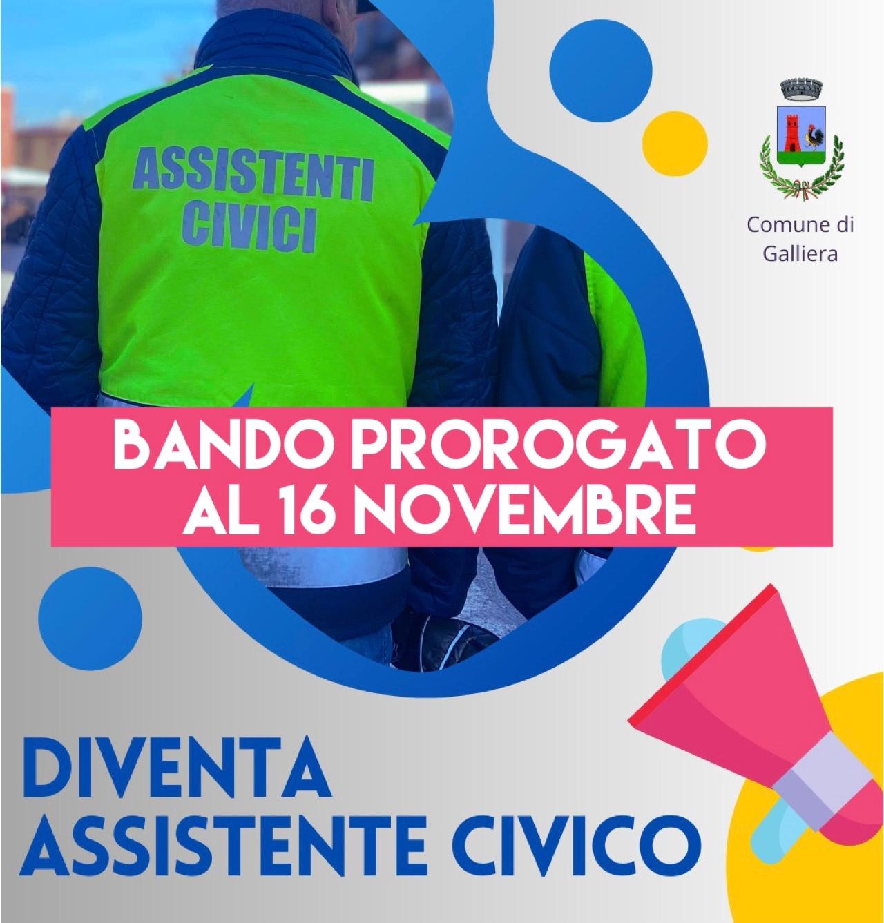 Si informa che con determinazione n. 72 del 24/10/2024 è stato prorogato il bando di selezione per i cittadini che intendano svolgere la funzione di assistente civico al 16/11/2024.