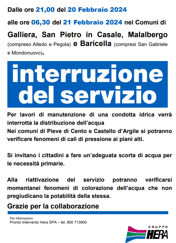 Riceviamo e condividiamo la seguente comunicazione di Hera: per lavori di manutenzione di una condotta è prevista la sospensione della fornitura idrica dalle ore 21:00 del 20/02 fino alle 06:30 del 21/02 nei comuni di