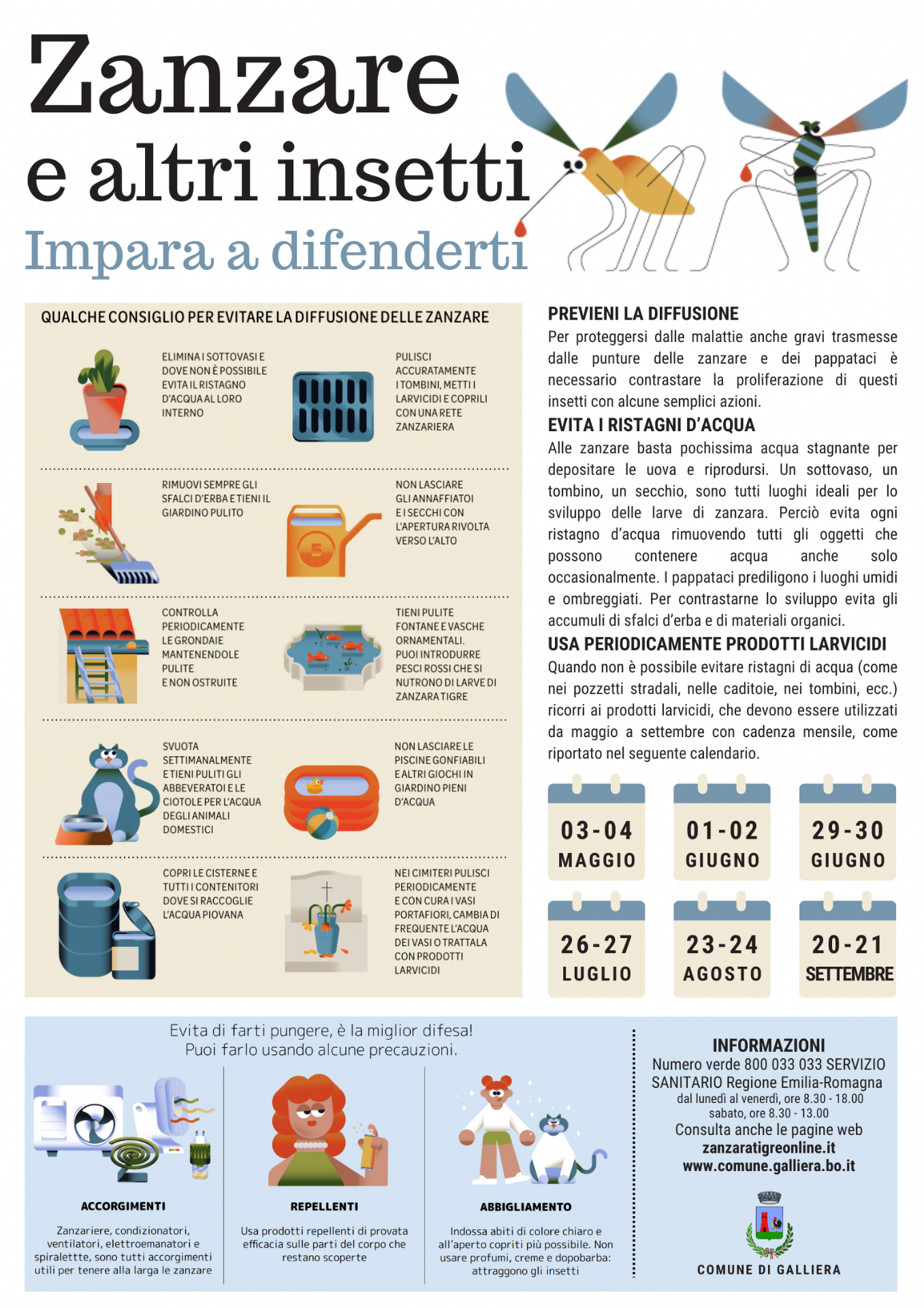 Anche quest’anno il programma di lotta alle zanzare prevede, già nei mesi primaverili, lo svolgimento di trattamenti larvicidi nelle caditoie stradali e lungo i canali (entrambi effettuati dal Comune di Galliera) e dei tombini siti nelle aree private (effettuati dai cittadini). I trattamenti adulticidi invece sono previsti solo in casi eccezionali, su indicazione di AUSL al fine di evitare fenomeni di resistenza negli insetti.
