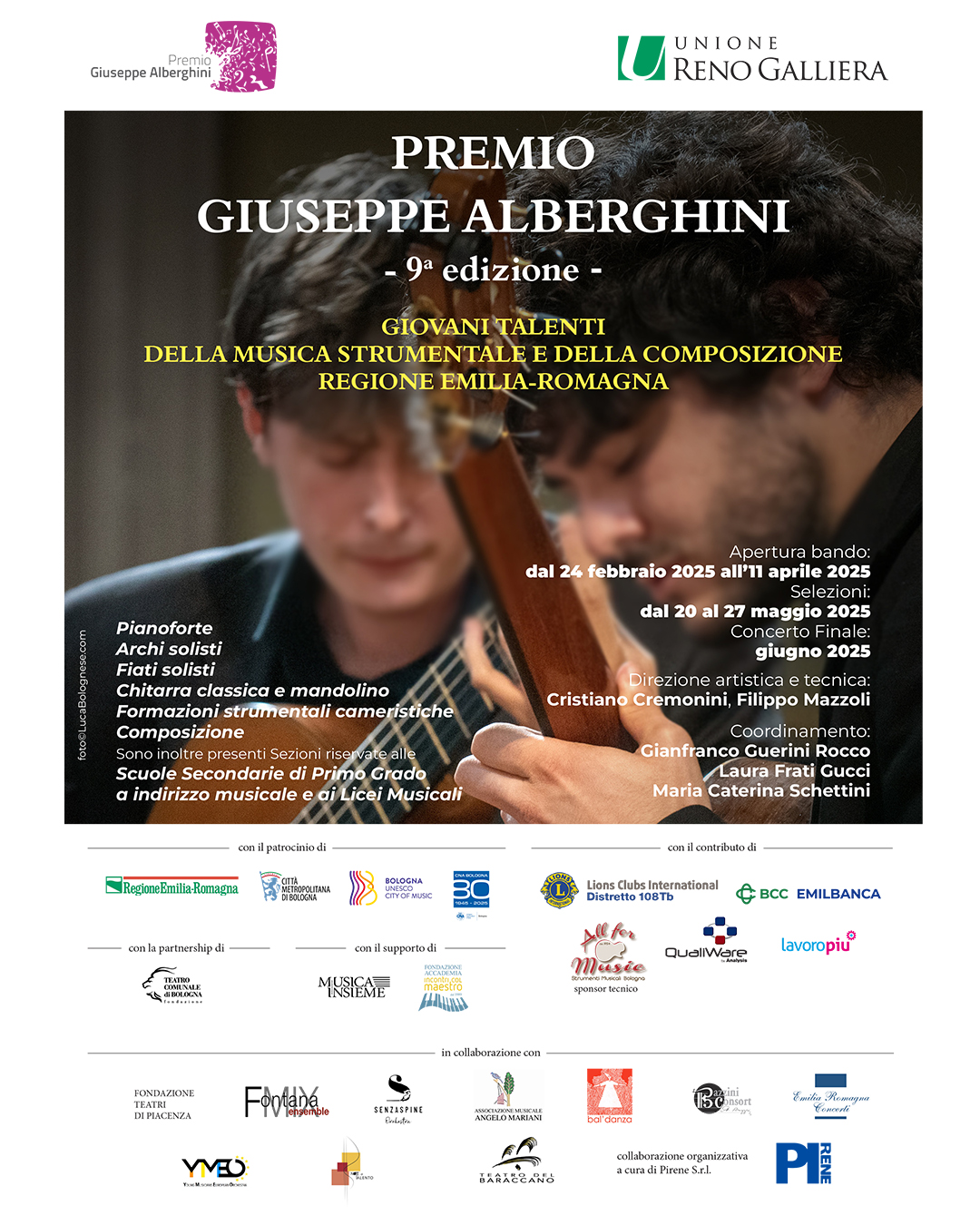 L’Unione Reno Galliera, in collaborazione con Teatro Comunale di Bologna, Musica Insieme, Accademia Internazionale di Imola e Lions Clubs International, indicono la Nona edizione del Premio Giuseppe Alberghini, per giovani talenti della musica strumentale e della composizione, della Regione Emilia-Romagna.