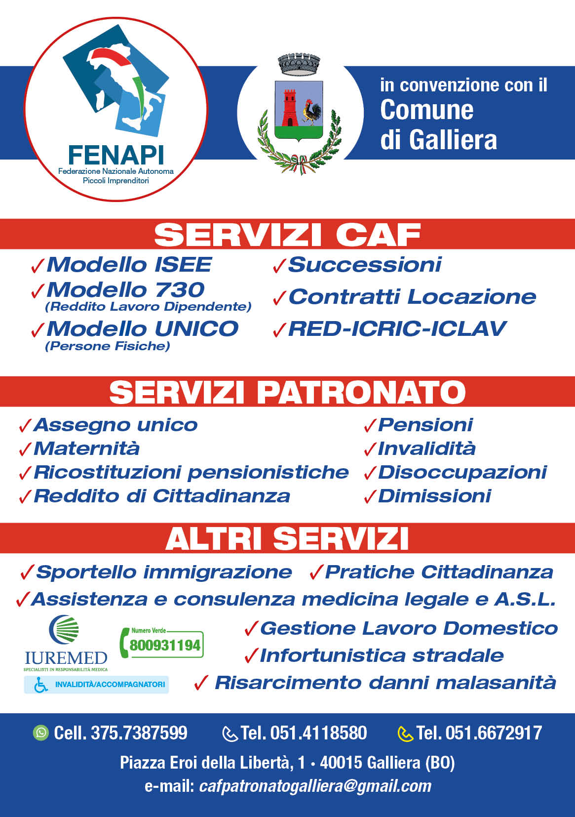 Per informazioni e per fissare un appuntamento è possibile telefonare al numero 051-6672917 negli orari sopra indicati. Nelle altre giornate è possibile contattare lo sportello ai seguenti recapiti: tel. 0514118580 - tel. 3757387599 - email: cafpatronatogalliera@gmail.com