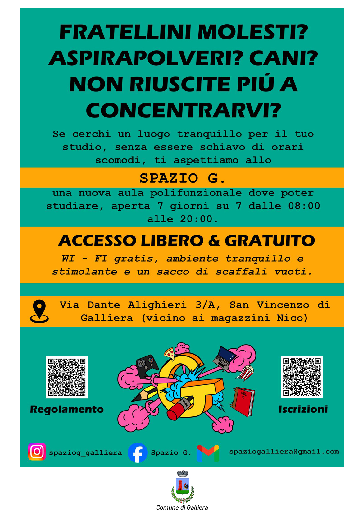 Sempre in questa pagina trovate il Regolamento dello Spazio G., da leggere con grande attenzione e sottoscrivere in ogni sua parte; al suo interno troverete ogni indicazione utile per una corretta fruizione della struttura.