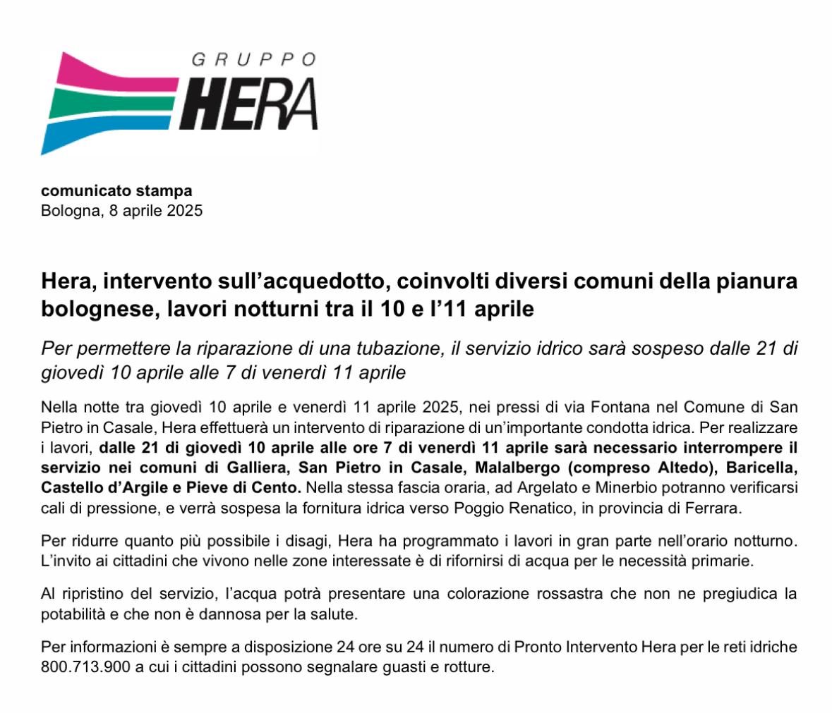 Riceviamo e condividiamo la seguente comunicazione di Hera:Nella notte tra giovedì 10 aprile e venerdì 11 aprile 2025, nei pressi di via Fontana nel Comune di San Pietro in Casale, Hera effettuerà un intervento di riparazione di un’importante condotta idrica. Per realizzare i lavori, dalle 21 di giovedì 10 aprile alle ore 7 di venerdì 11 aprile sarà necessario interrompere il servizio nei comuni di Galliera, San Pietro in Casale, Malalbergo (compreso Altedo), Baricella, Castello d’Argile e Pieve di Cento. Nella stessa fascia oraria, ad Argelato e Minerbio potranno verificarsi cali di pressione, e verrà sospesa la fornitura idrica verso Poggio Renatico, in provincia di Ferrara.