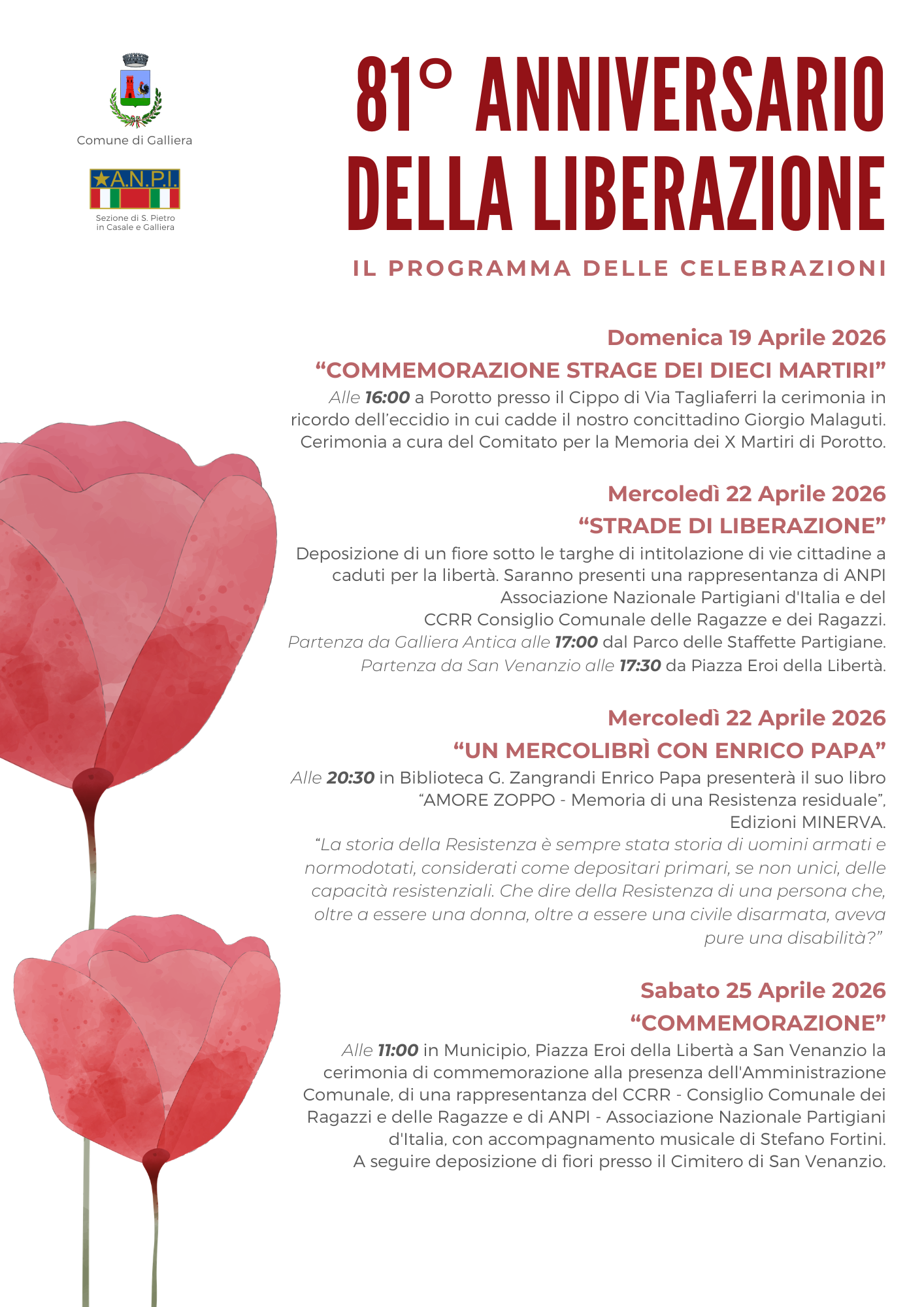Alle 11:00 in Municipio, Piazza Eroi della Libertà a San Venanzio la cerimonia di commemorazione alla presenza dell'Amministrazione Comunale, di una rappresentanza del CCRR - Consiglio Comunale dei Ragazzi e delle Ragazze e di ANPI - Associazione Nazionale Partigiani d'Italia, con accompagnamento musicale di Stefano Fortini.