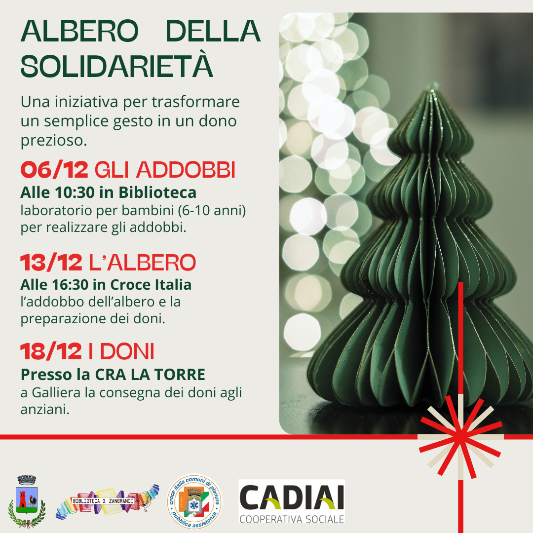 💫 Sabato 13 dicembre alle 16:30 l’ addobbo dell’albero della solidarietà: bambine e bambini potranno portare una decorazione da loro realizzata o un disegno che sarà consegnato agli anziani della CRA “La Torre”.
